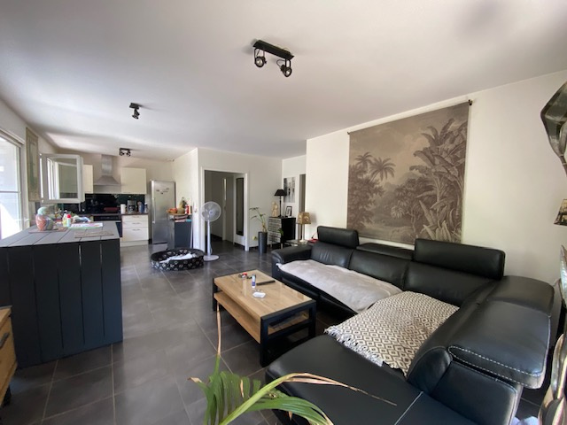 Entrée, toilettes, salon avec cuisine équipée ouverte, 3 chambres, salle de bains, garage attenant.