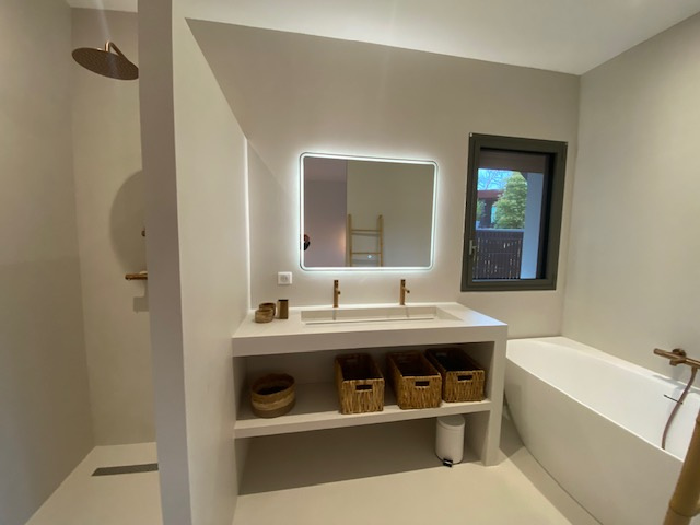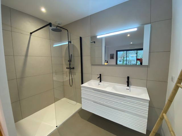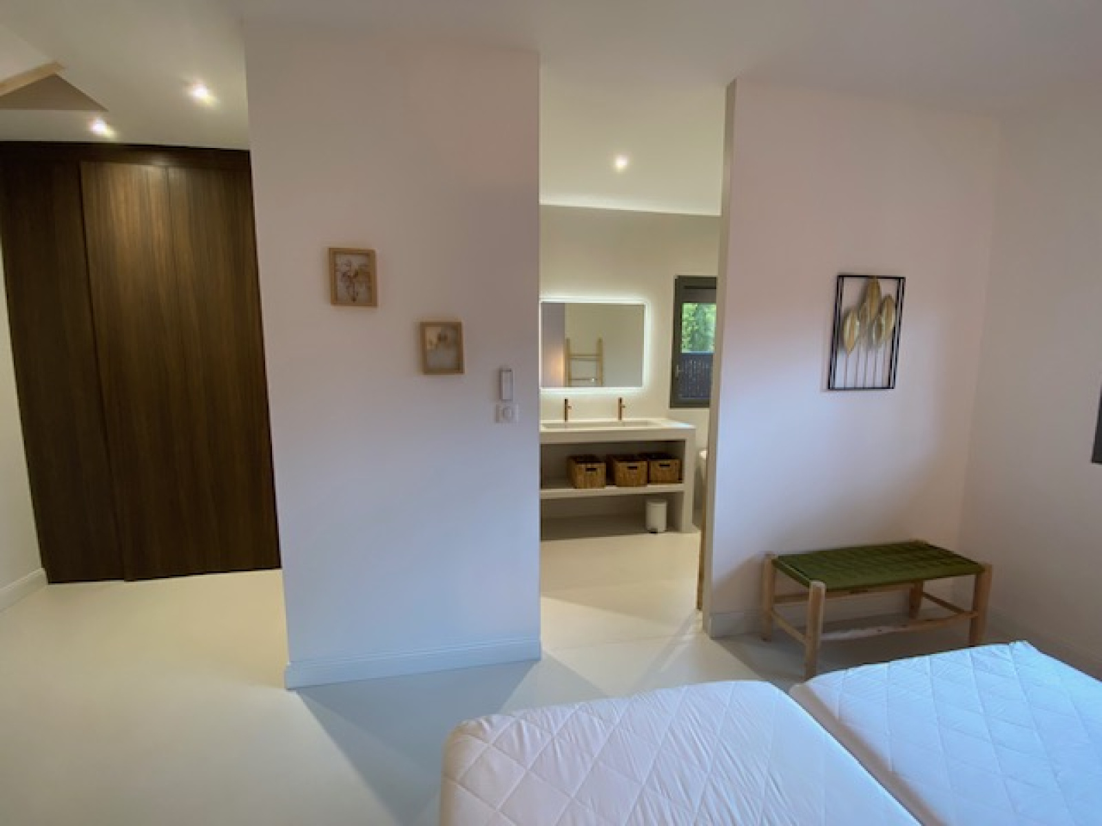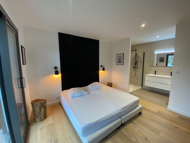 Immense salon avec cuisine équipée ouverte, cellier-buanderie, quatre suites (chambre, dressing et salle d'eau), Mezzanine-bureau et garage attenant.