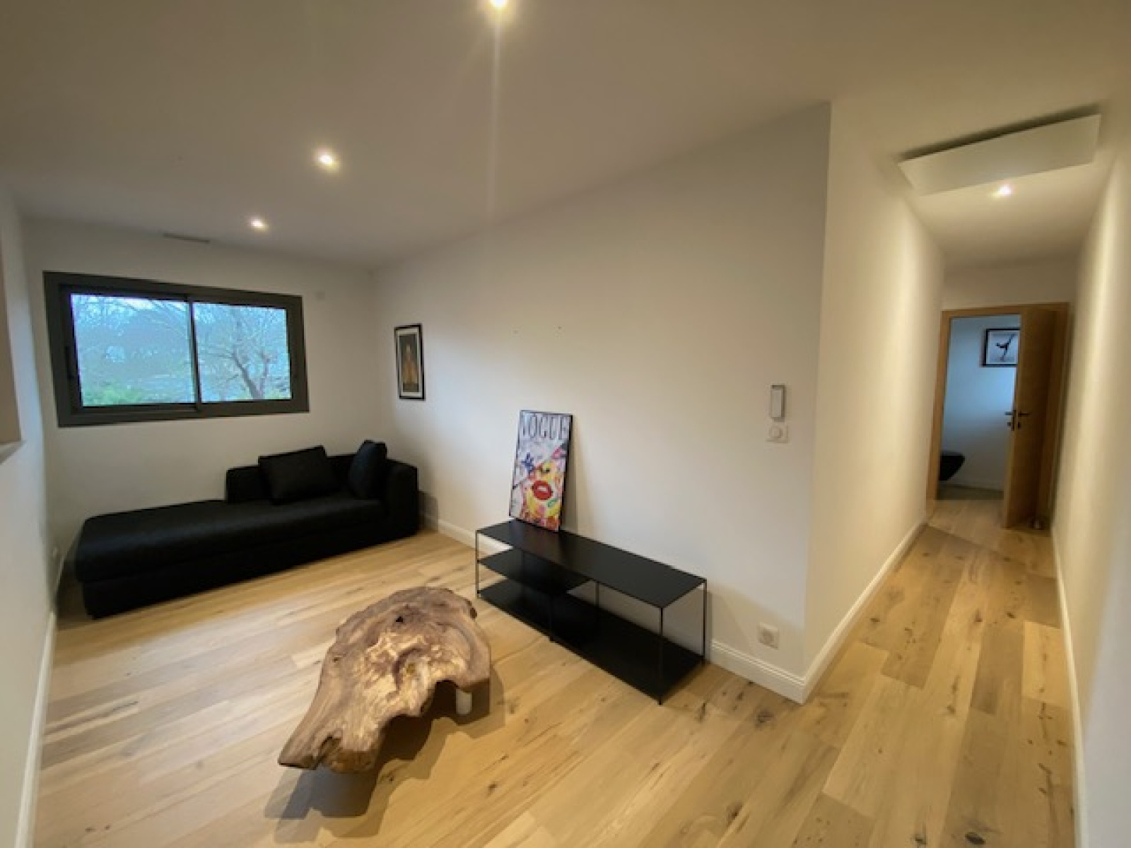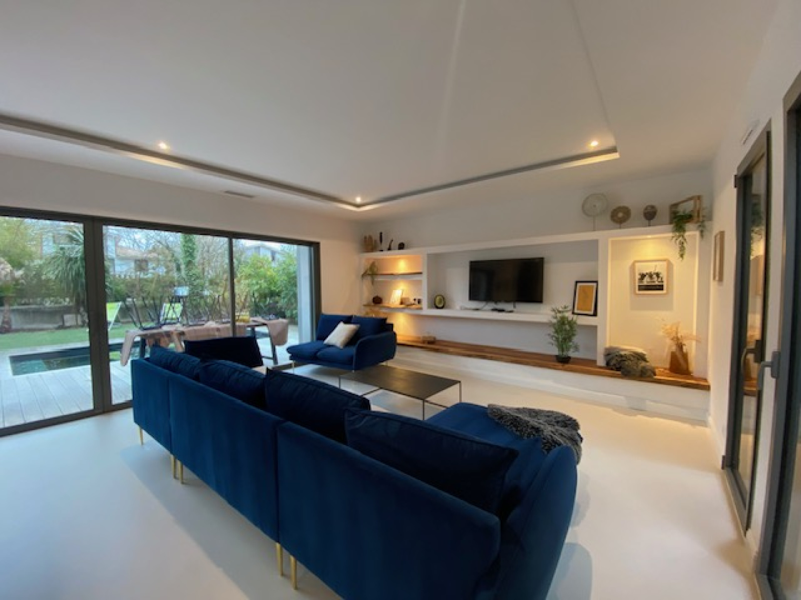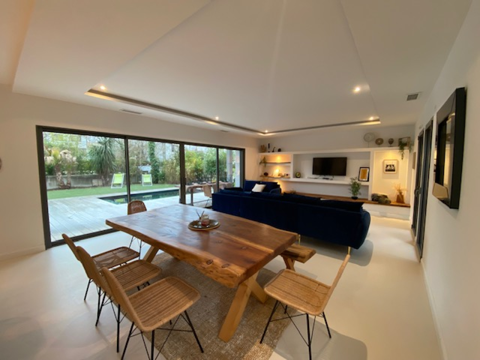 Le salon et la cuisine communiquent sur une très belle terrasse avec piscine, par de larges baies vitrées à galandage.