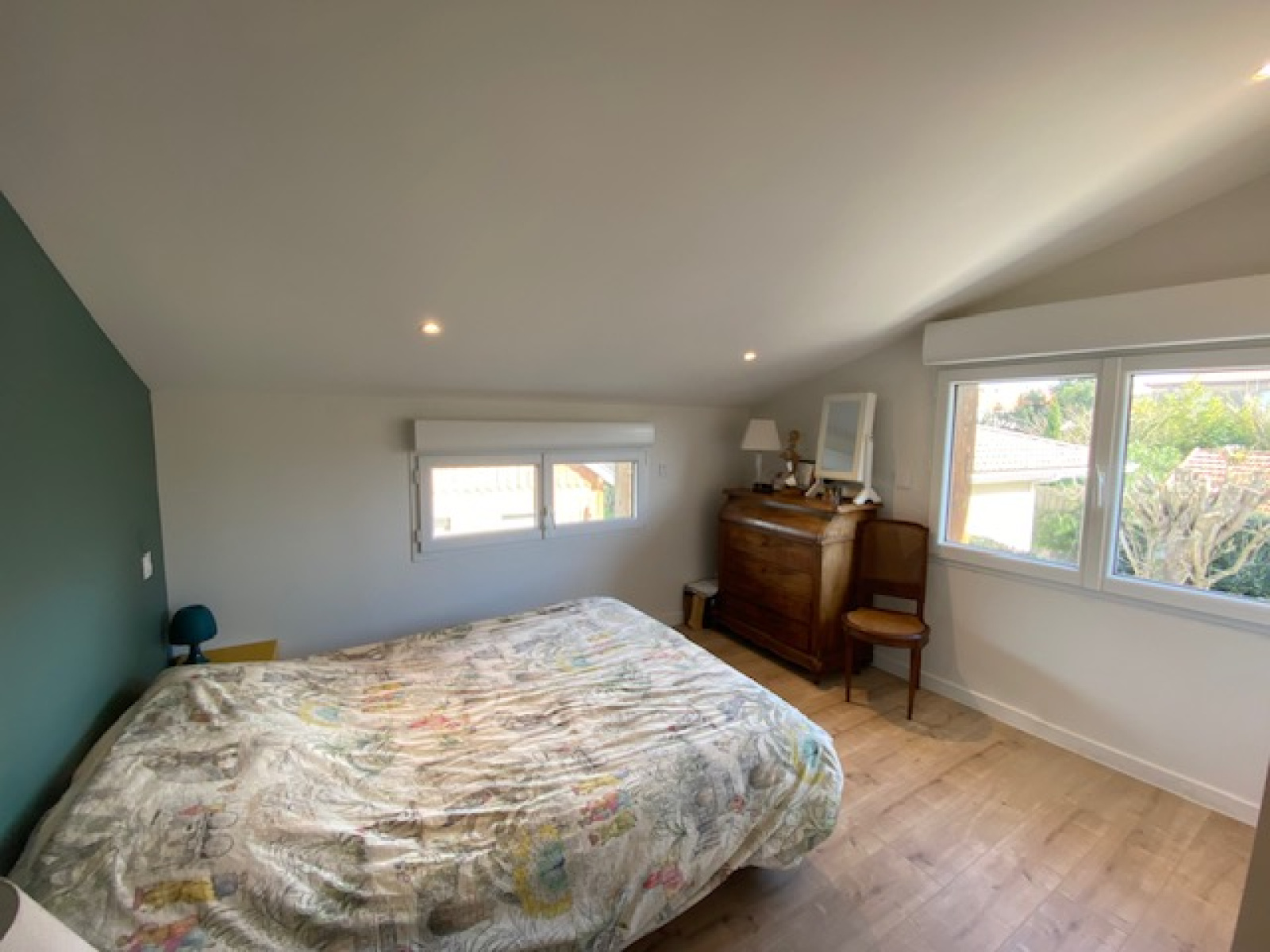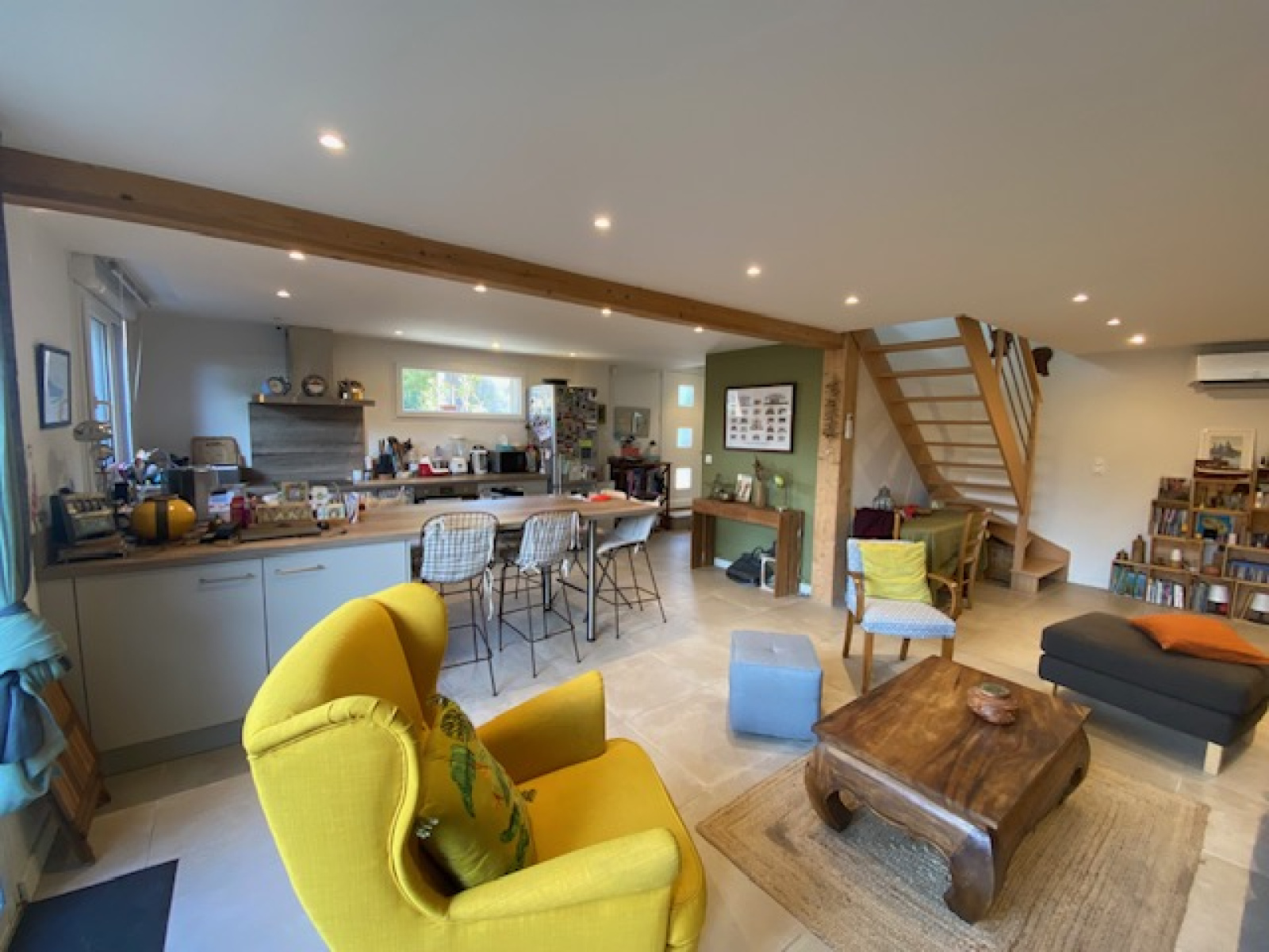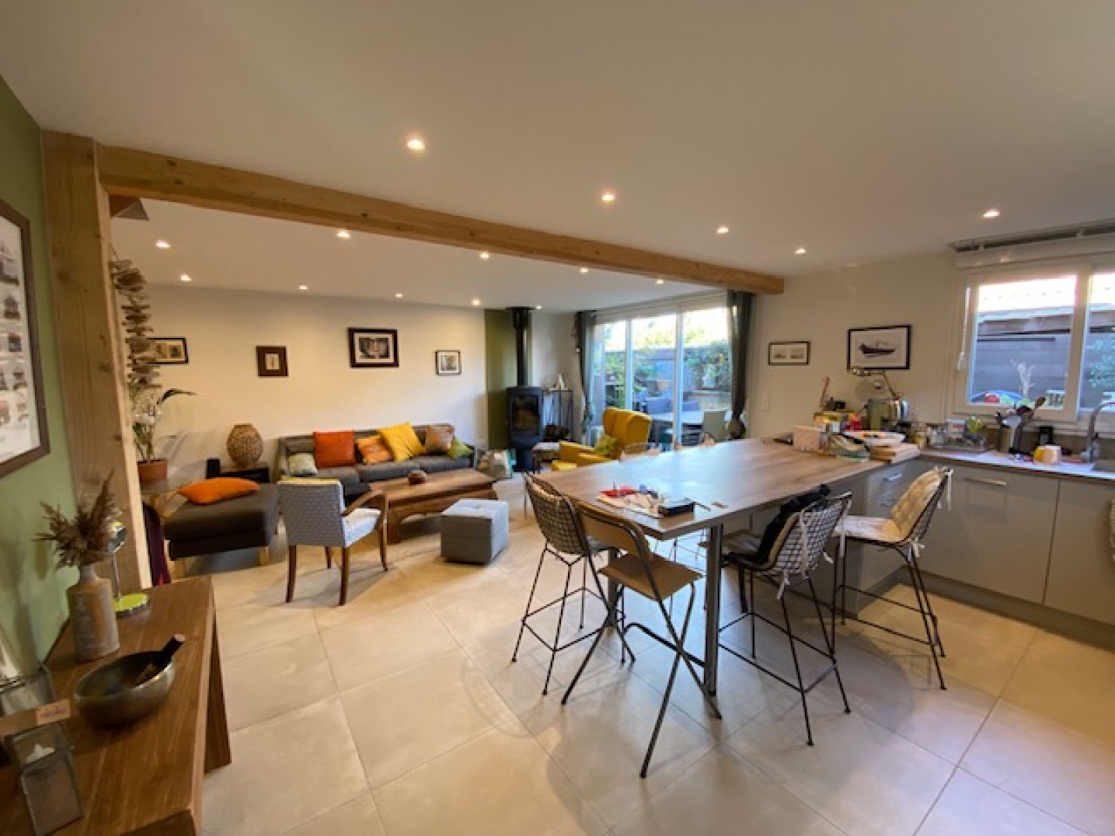 La Teste-de-Buch (33260)Adorable maison de ville avec terrasse, en plein coeur de la Teste, comprenand sur deux niveaux : Entrée, vaste salon avec poêle à bois et cuisine équipée ouverte, buanderie, 3 grandes chambres, mezzanine, salle d'eau et deux toilettes.