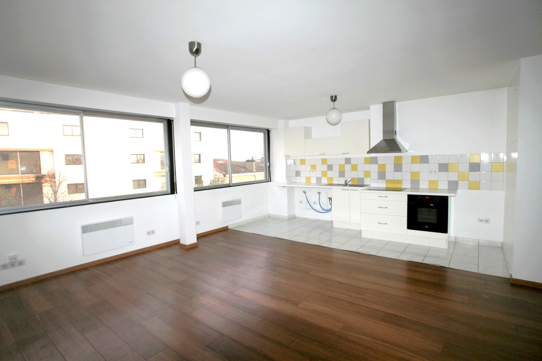 Entrée, salon-séjour avec suisine américaine équipée, 2 chambres d'environ 11 m², salle d'eau de 5 m², wc indépendant.